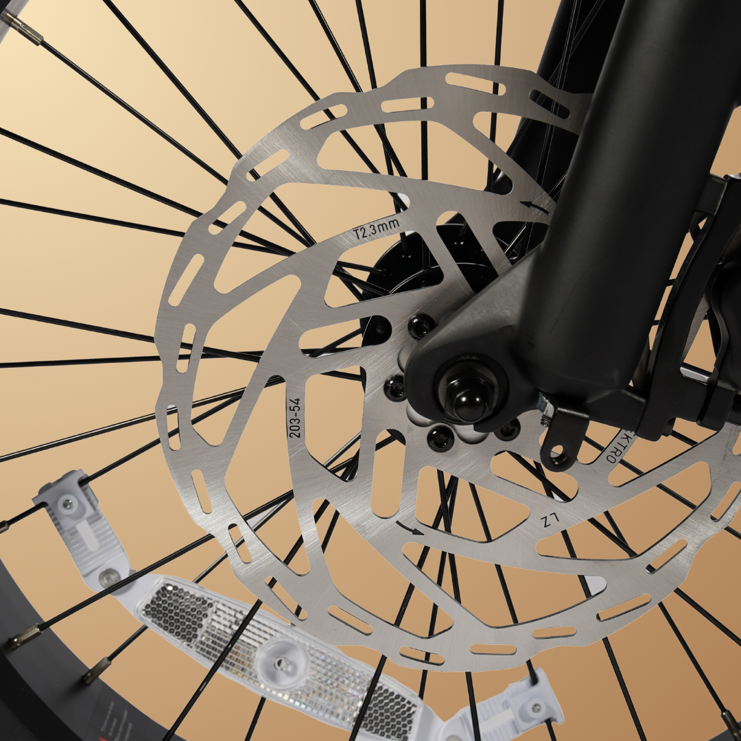 - 203mm 4-piston Tektro hydraulic brakes - serious stopping power.